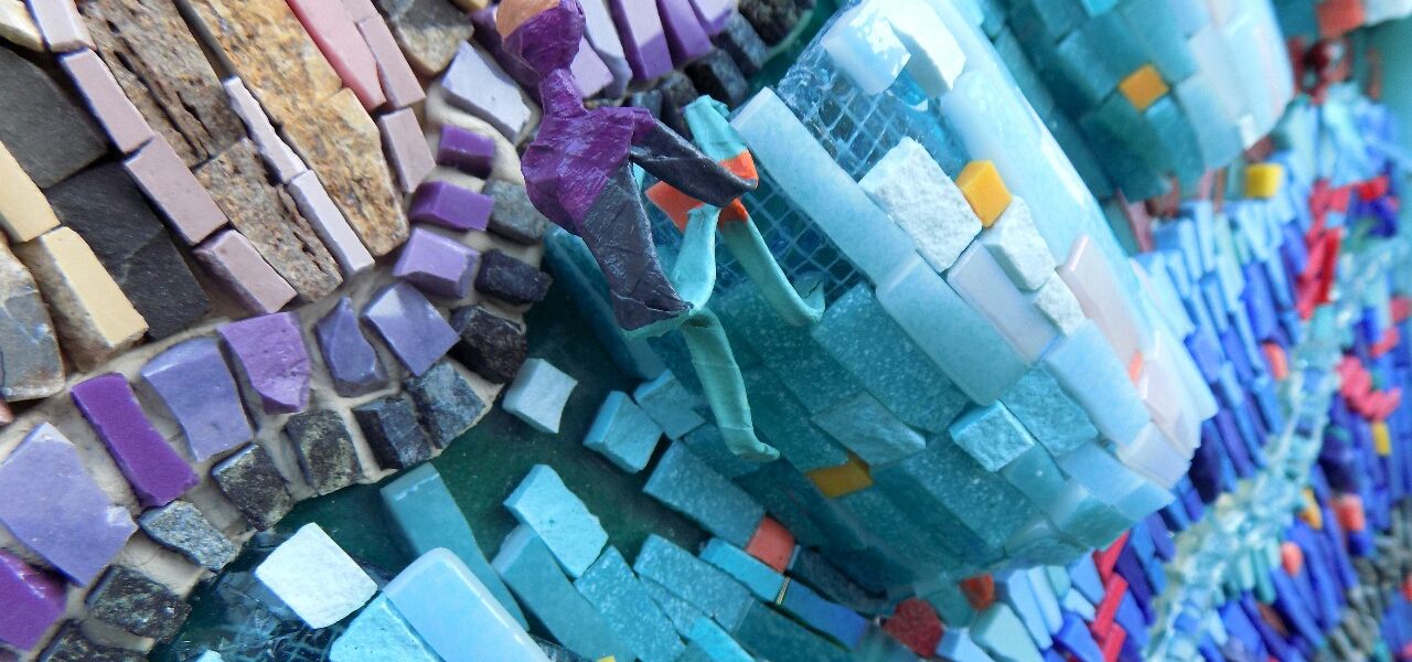 Materiales: Está realizada con muchos y diferentes materiales. Pieza ondulada en malla y resina, piezas moldeadas en resina poliéster, vidrio templado, piezas de resina al agua, venecitas, piedra laja, mármol, pasta vítrea, smalti e hilos de vidrio. Los habitantes de Ágata están realizados en alambre y papel.