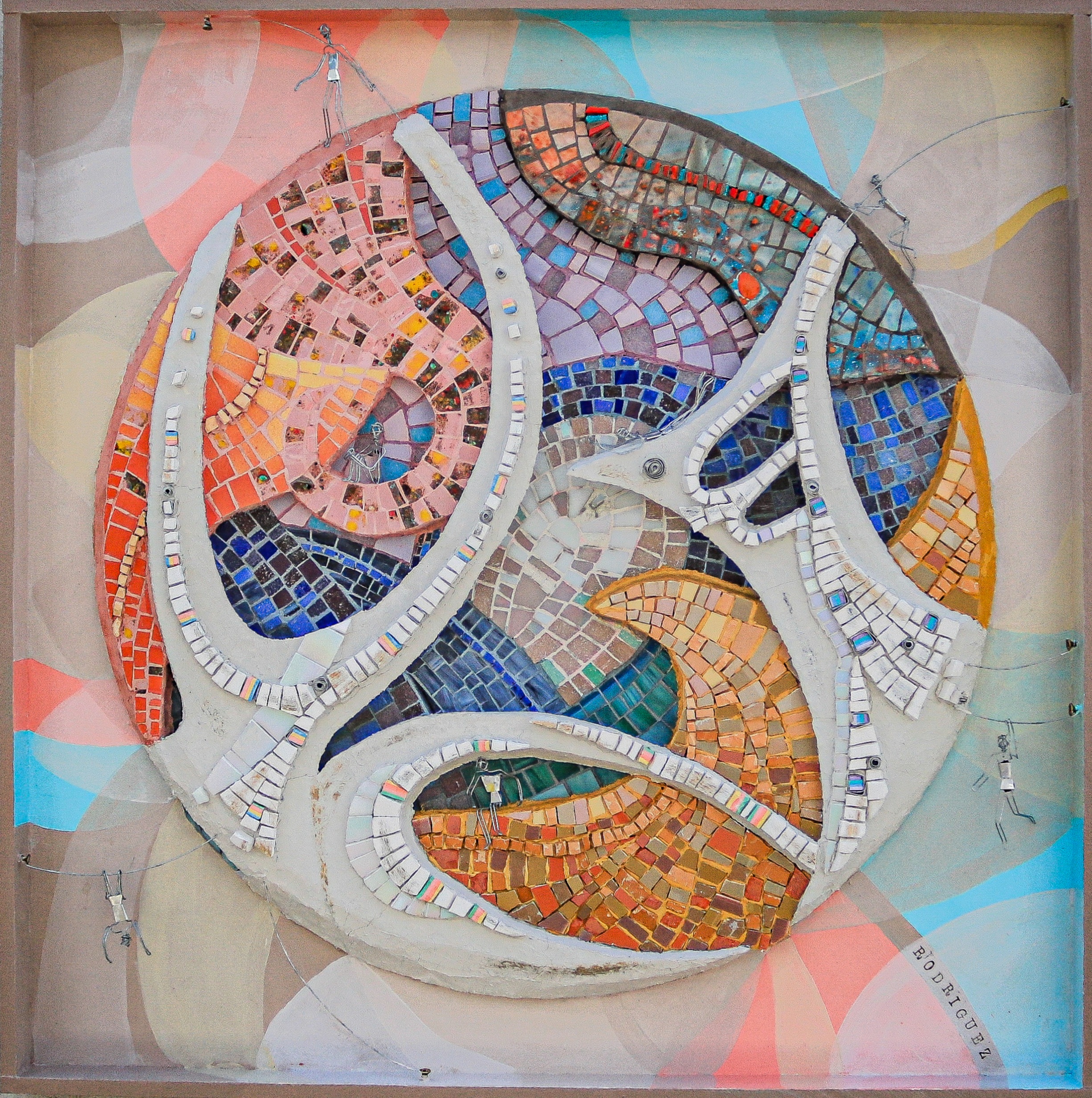 Azulejos, venecitas, vidrio spectrum, resina mineral, alambre, aluminio.