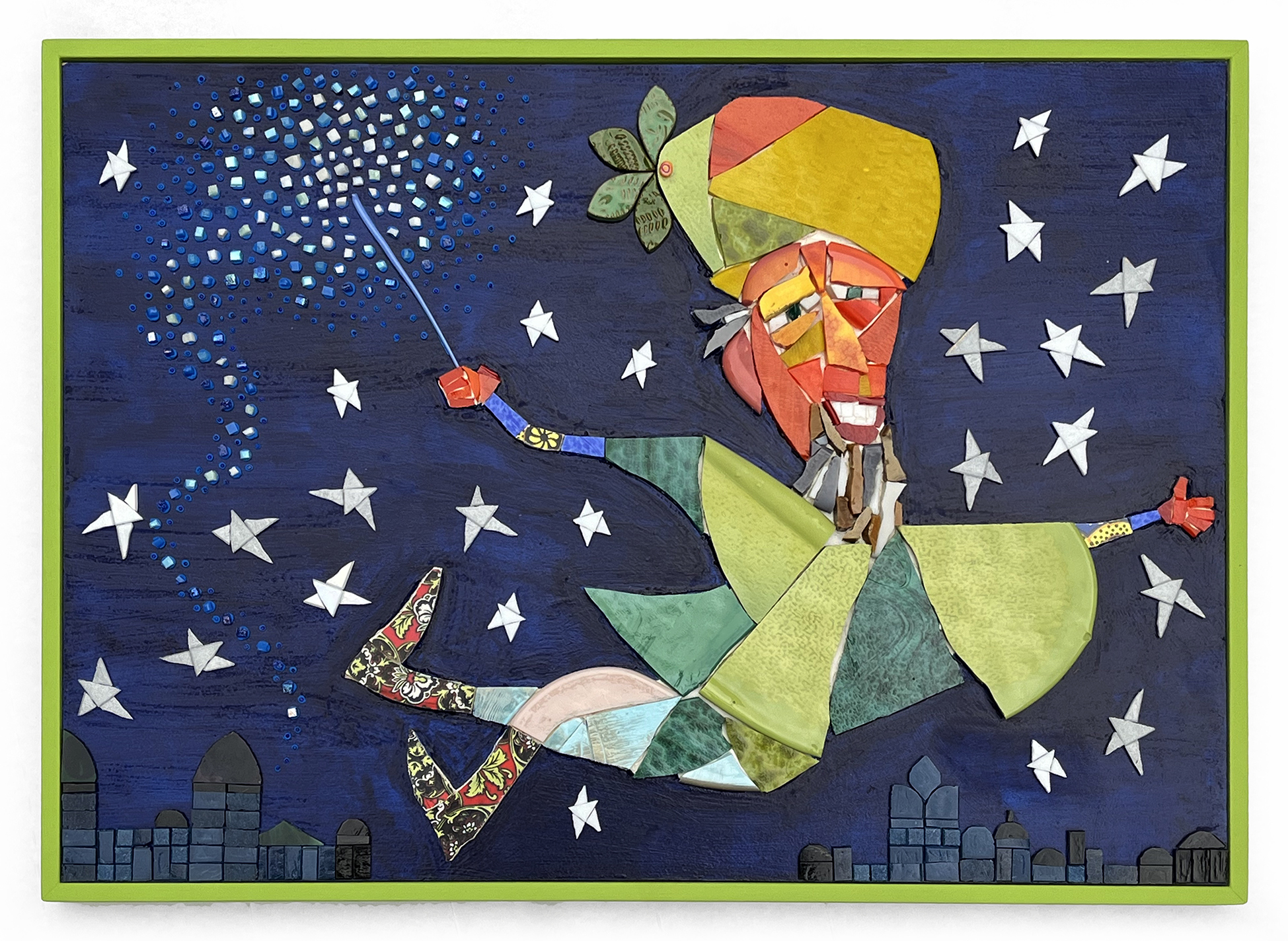 En la escena aparece como personaje principal Balthazar el mago, suspendido en el aire, se lo puede ver en una posición relajada mientras que su magia está fluyendo. De fondo, el cielo estrellado, y a lo lejos los castillos de Gondar. El personaje, las estrellas, los castillos y los destellos de la vara están realizados en mosaico, mientras que todo el cielo de fondo está pintado. Esto le da fuerza a la idea de volumen, y protagonismo al personaje. La leyenda cuenta que el mago Balthazar, protector del rey, es oriundo de la ciudad etíope de Gondar.![]()