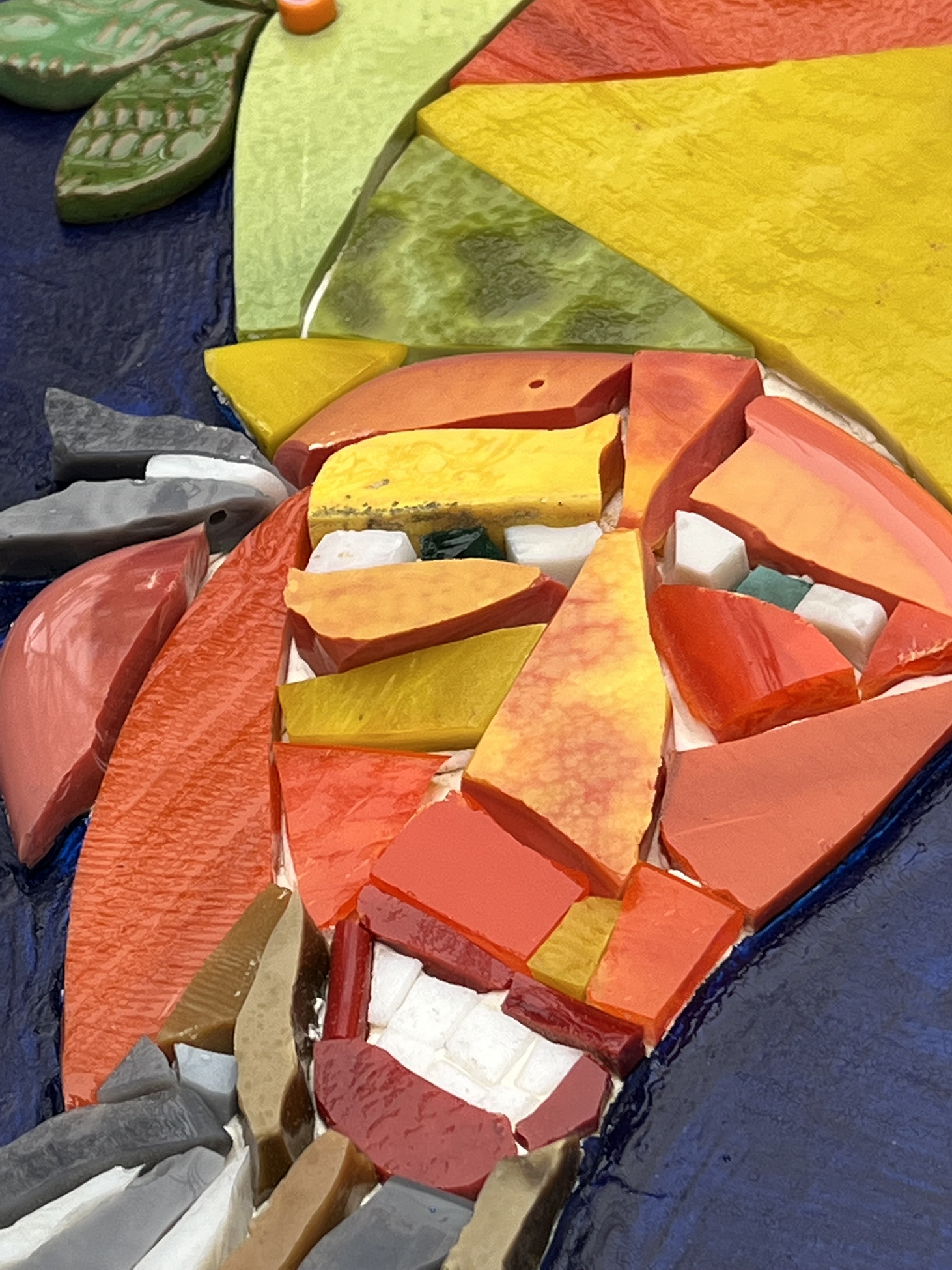 Smalti, filati, mosaico veneciano, azulejo, mostacilla, millefiori, teselas cerámica, vidrio y pintura acrílica.