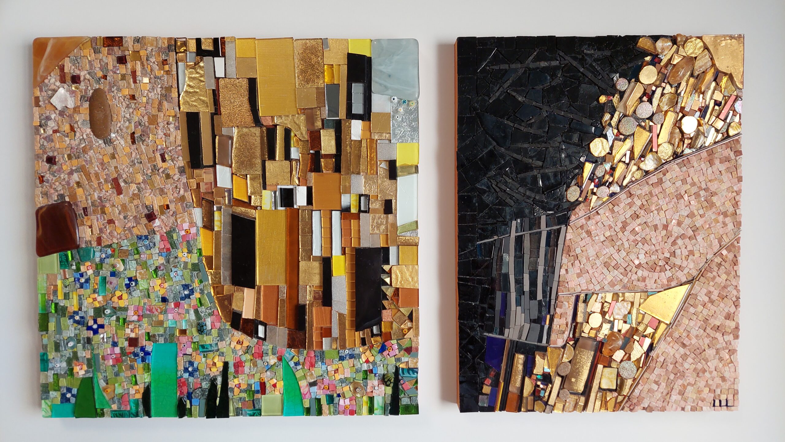 Vidrios de oro, smalti, piezas de vitrofusión, piedras naturales, milefiori, gres, filati, mármoles.