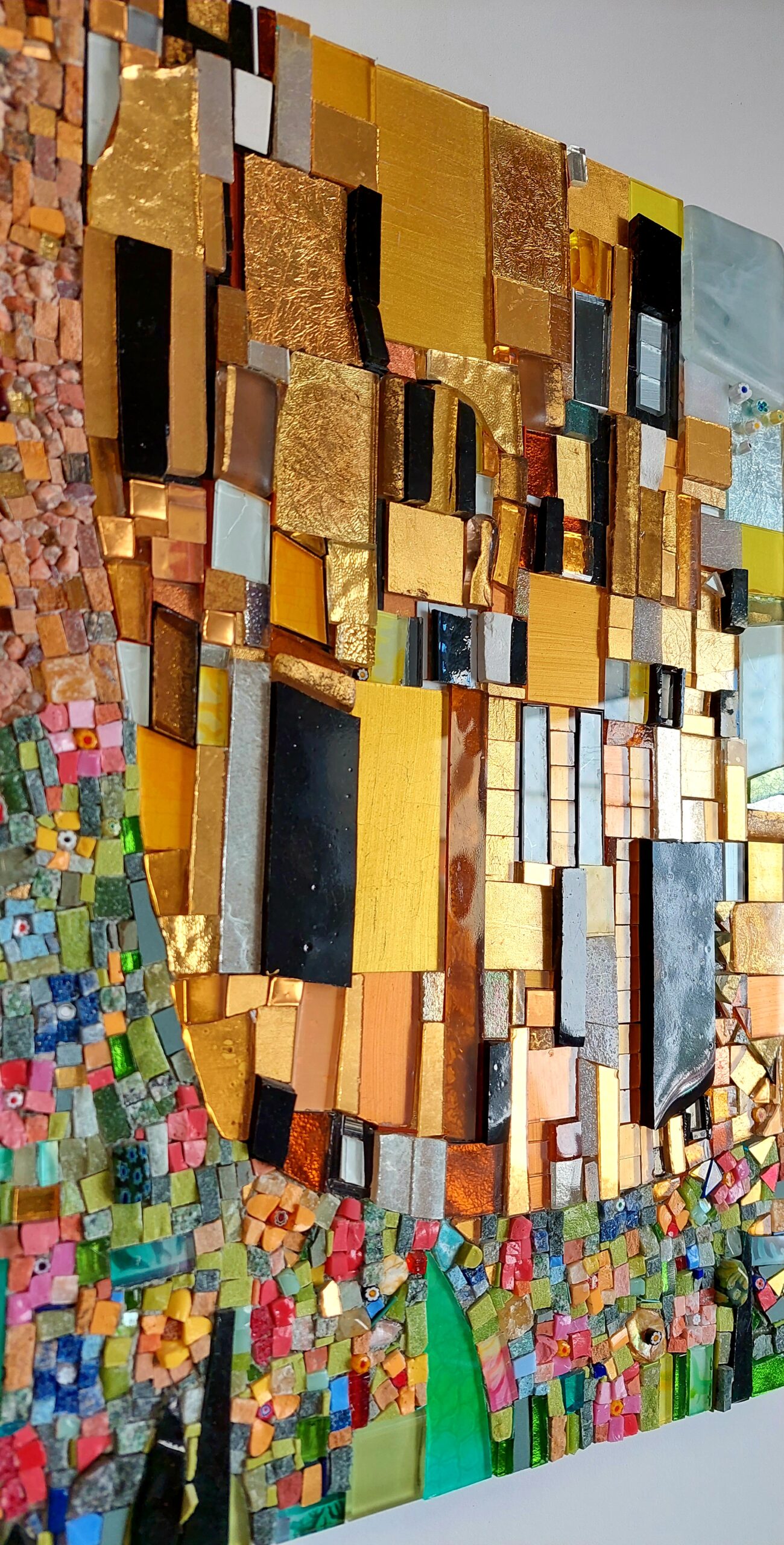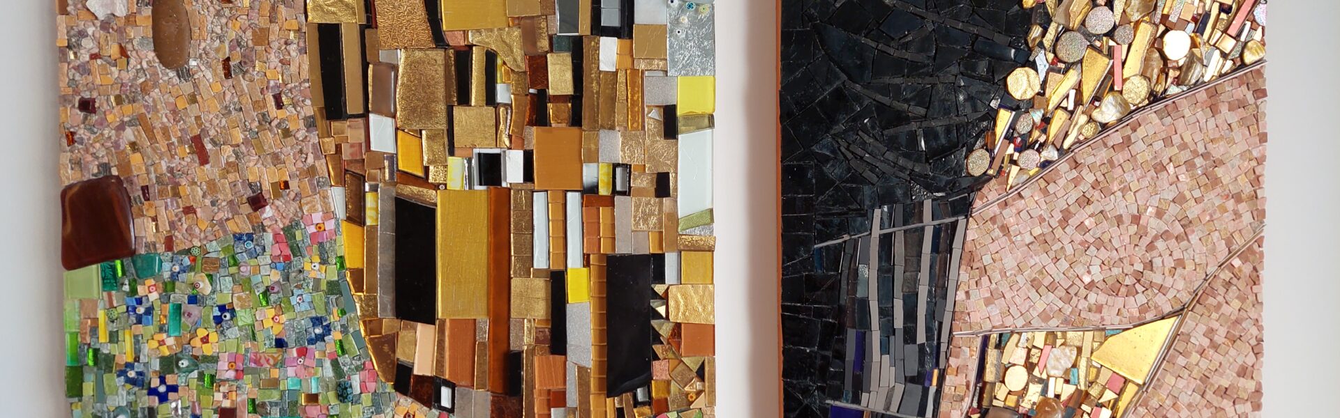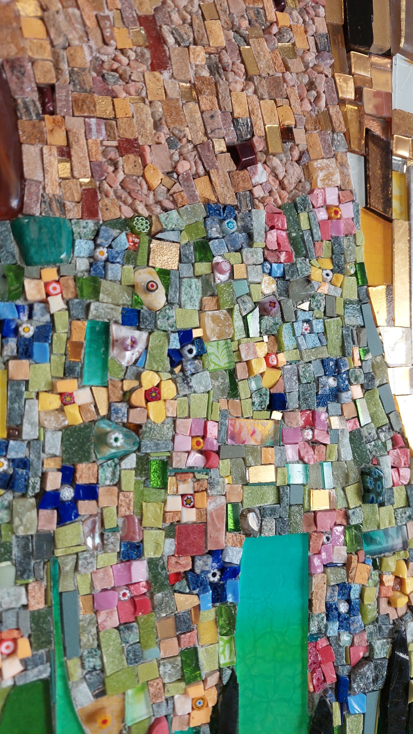 Vidrios de oro, smalti, piezas de vitrofusión, piedras naturales, milefiori, gres, filati, mármoles.