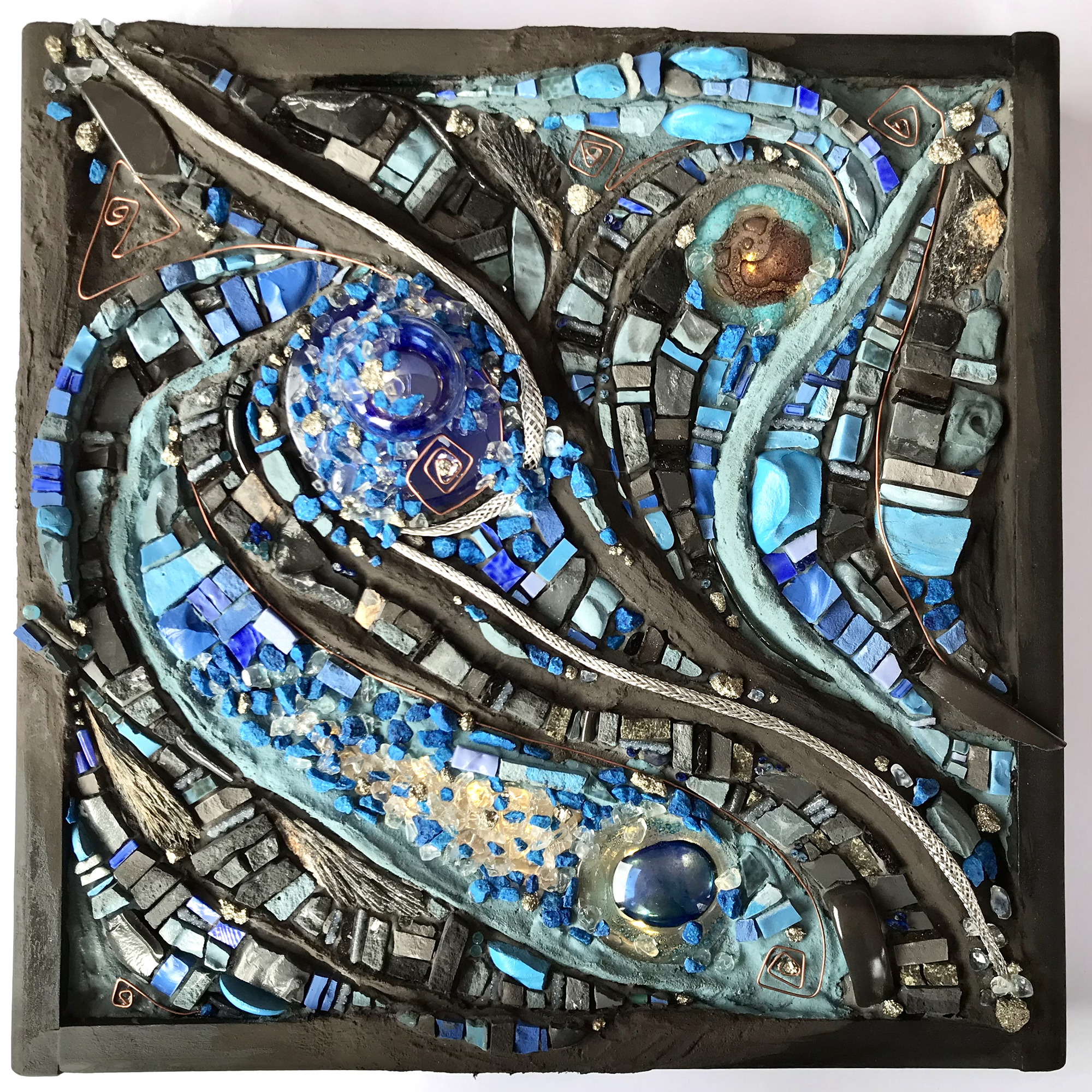 Smalti, resina ceramica, pastas cementicias, escallas de cristal, marmol y pirita. Cianita negra, piezas de vitrofusion. Retazos de objetos de vidrio y loza. Alambre de cobre y cable trenzado de aluminio, luz led.