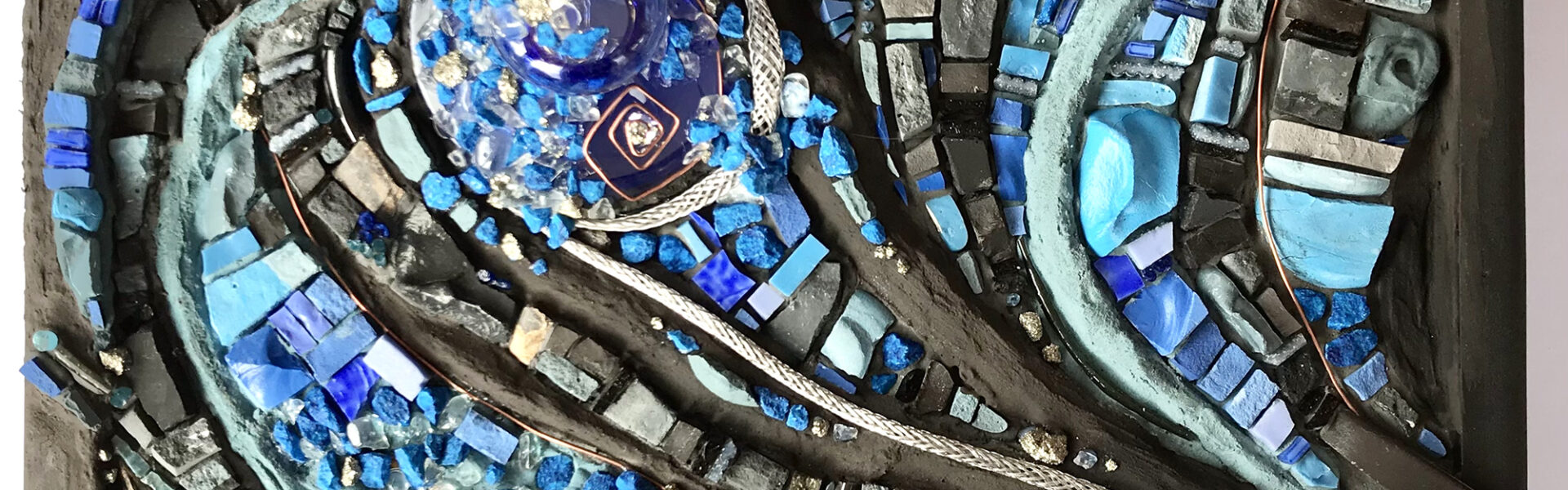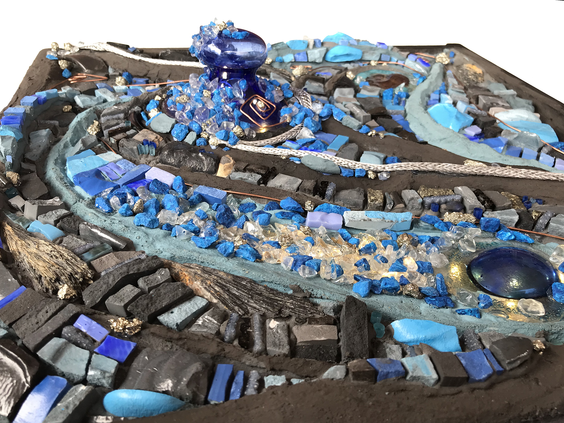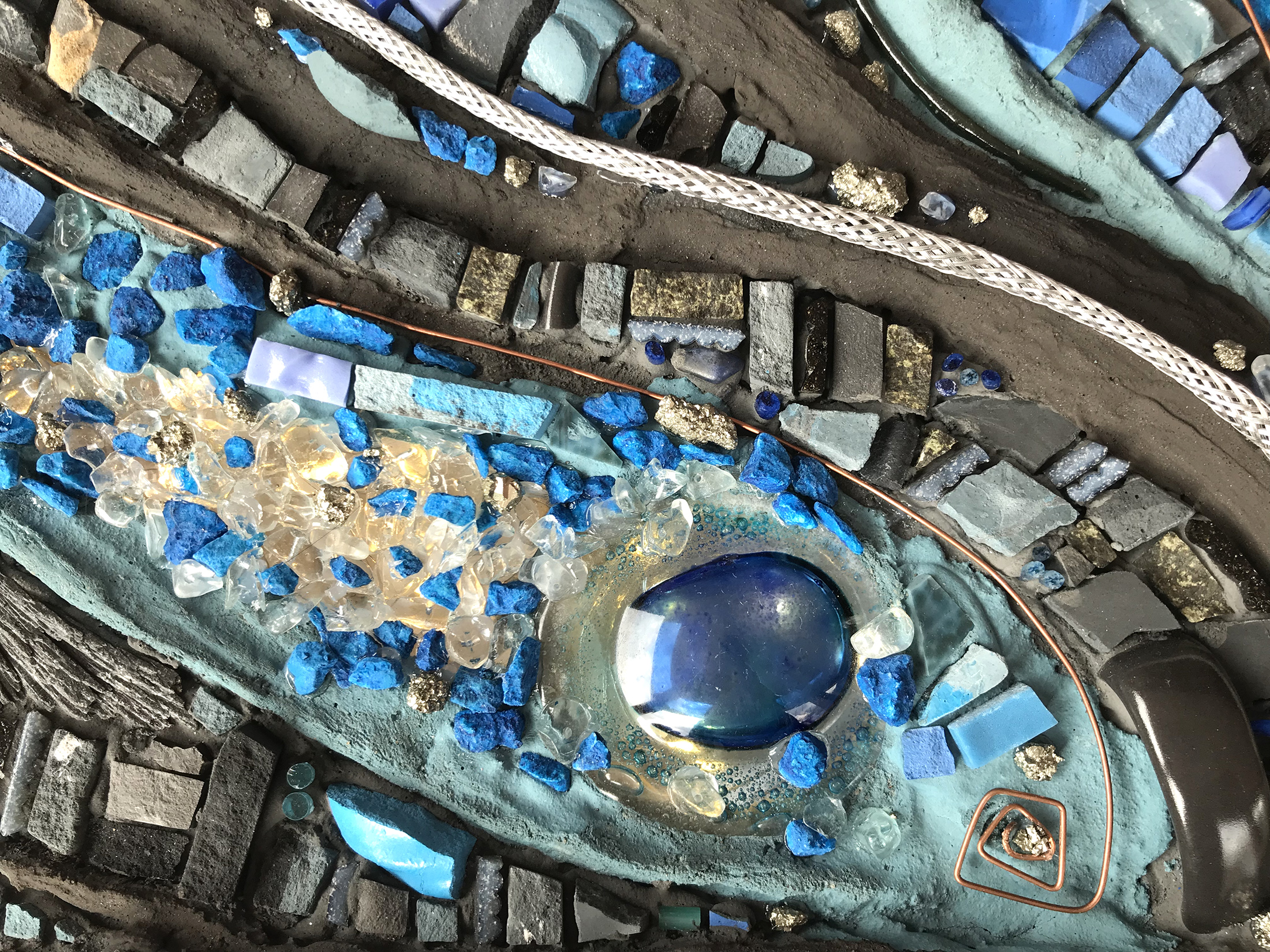 Smalti, resina ceramica, pastas cementicias, escallas de cristal, marmol y pirita. Cianita negra, piezas de vitrofusion. Retazos de objetos de vidrio y loza. Alambre de cobre y cable trenzado de aluminio, luz led.
