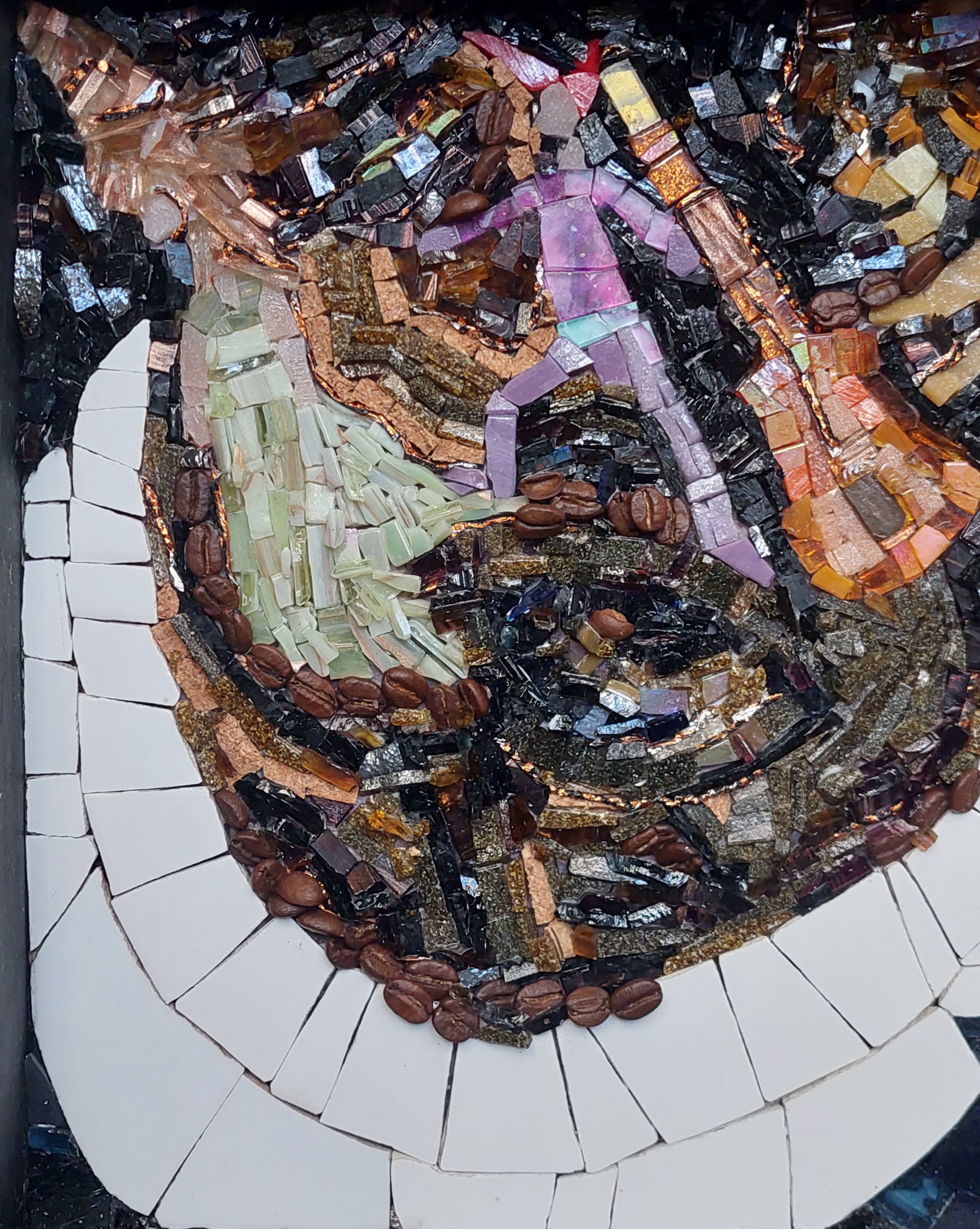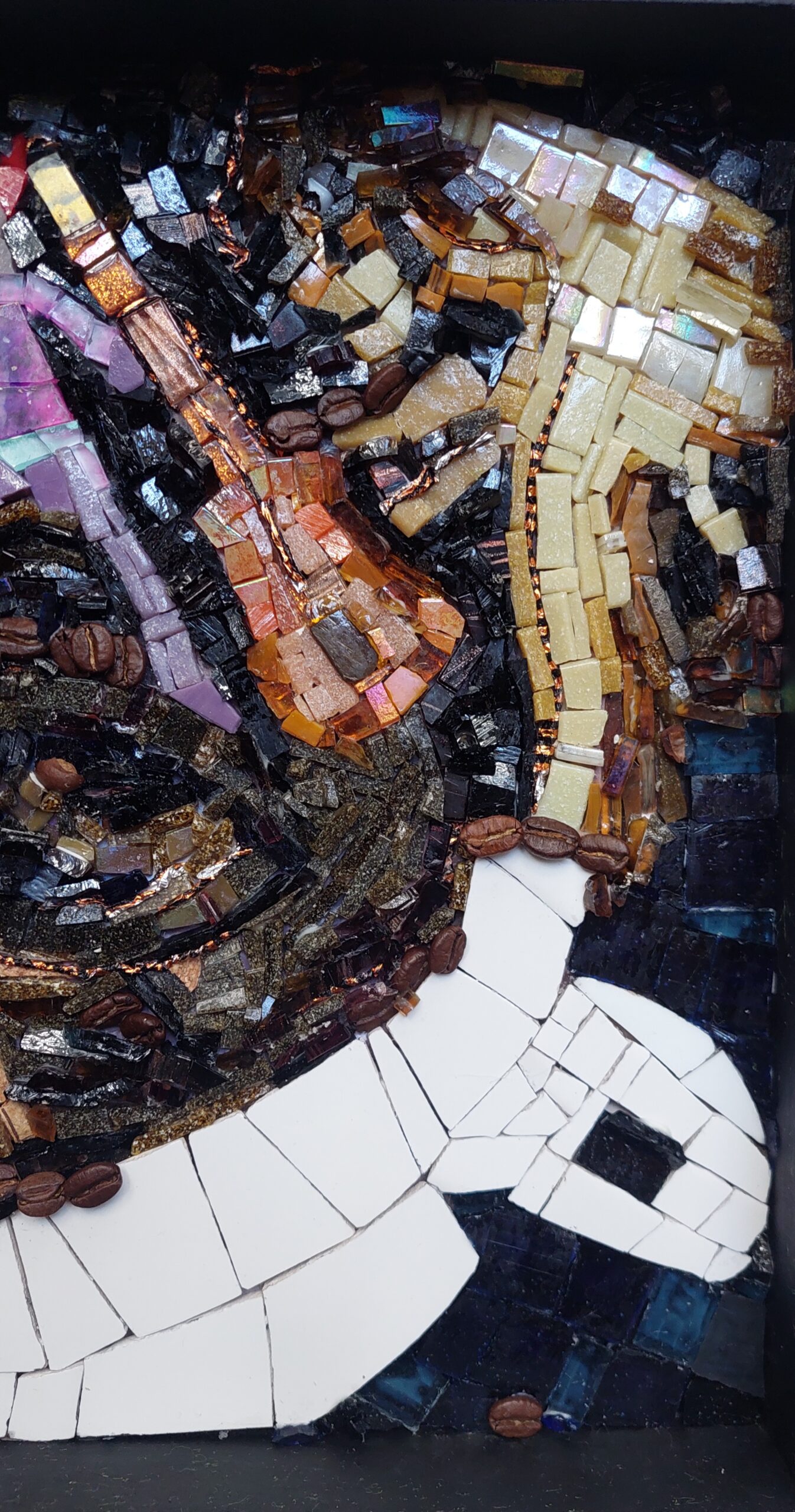 Venecitas, azulejos, teselas artesanales, corcho, papeles metálicos y granos de café.