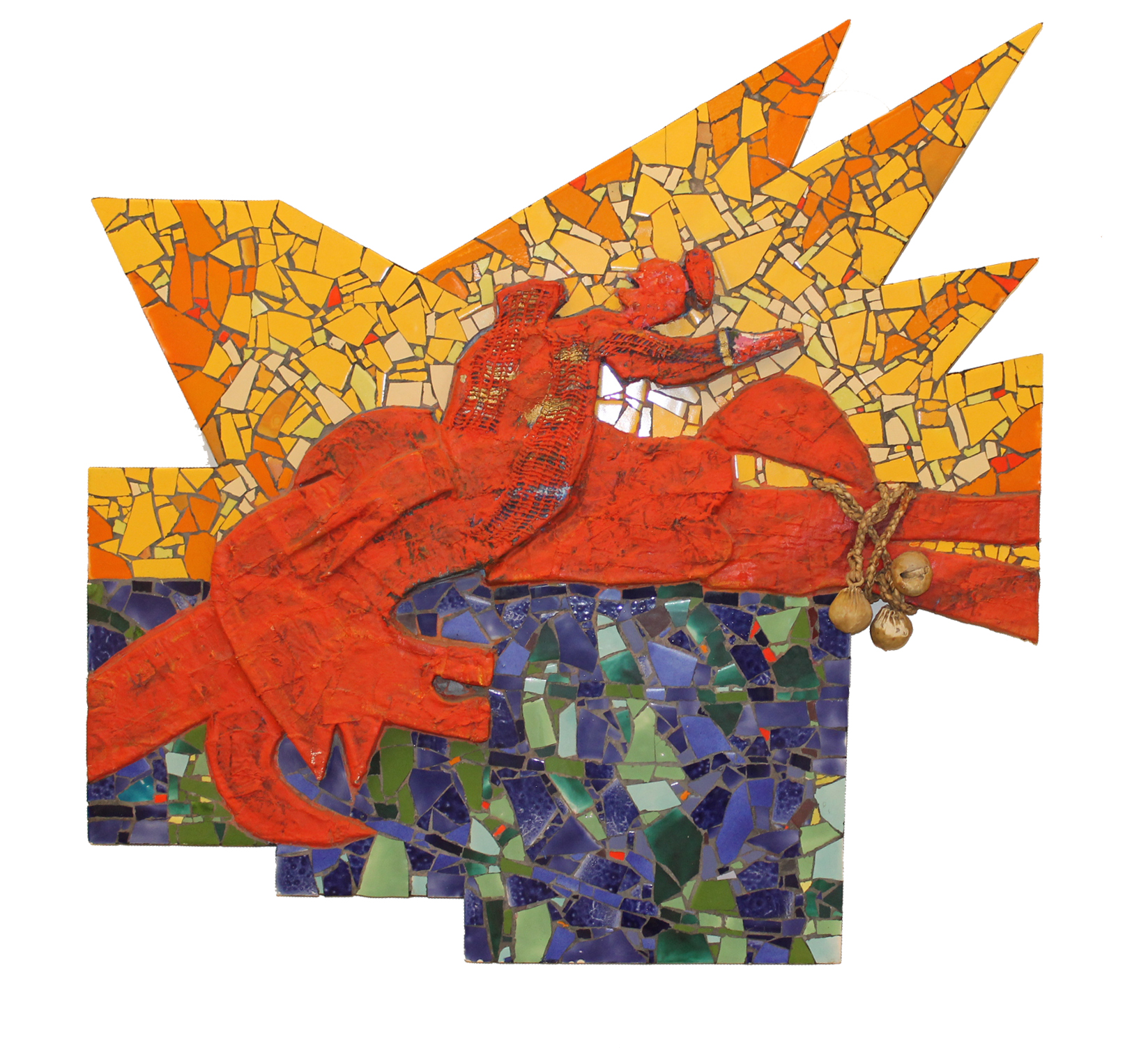 La obra está inspirada en el momento en el que al General Paz le bolean el caballo, después de una batalla con Quiroga, y lo toman prisionero durante muchos años, tiempo en el que transcurre una parte importante de la historia argentina entre unitarios y federales. Estos sucesos dieron pie a la realización de esta obra, que por un lado rompe el marco, la obra está inscripta en un cuadrado de 1 metro por 1 metro pero los bordes son irregulares; por otra parte está hecho sobre un fondo de mosaico amarillo y azul, la figura del general Paz y el caballo están hechas en papel mache pintado. Las boleadoras son auténticas, compradas en una casa de regionales. Esta obra es de gran interés personal, es una interesante propuesta plástica y de factura.![]()
