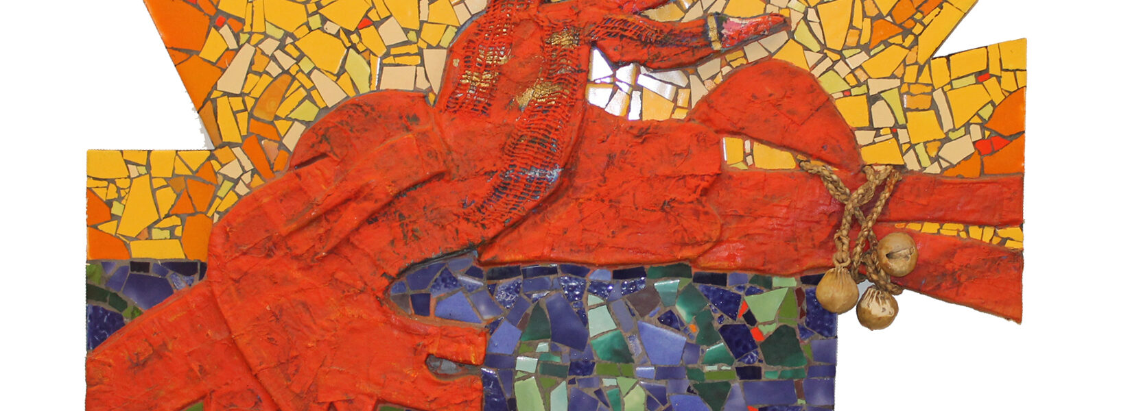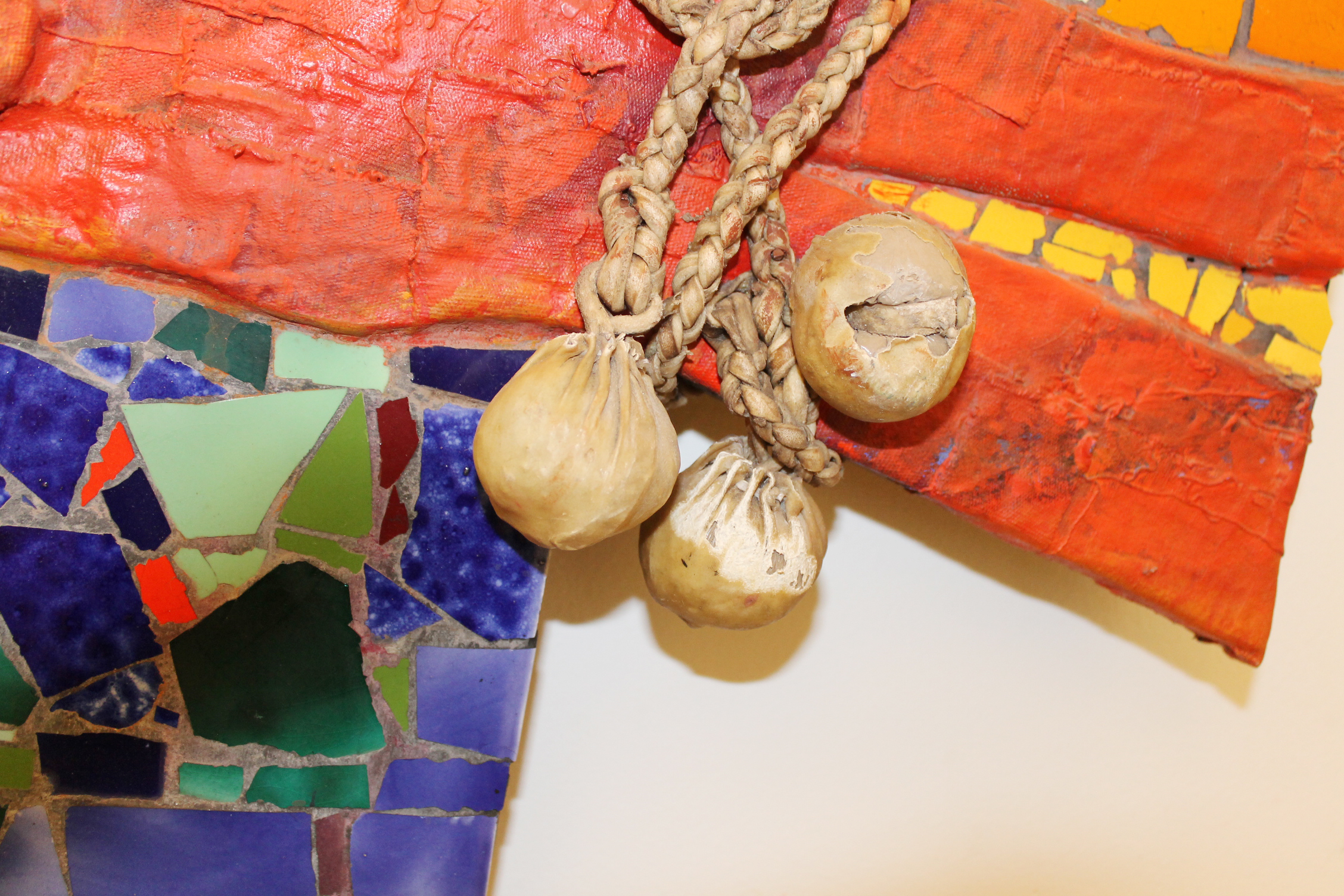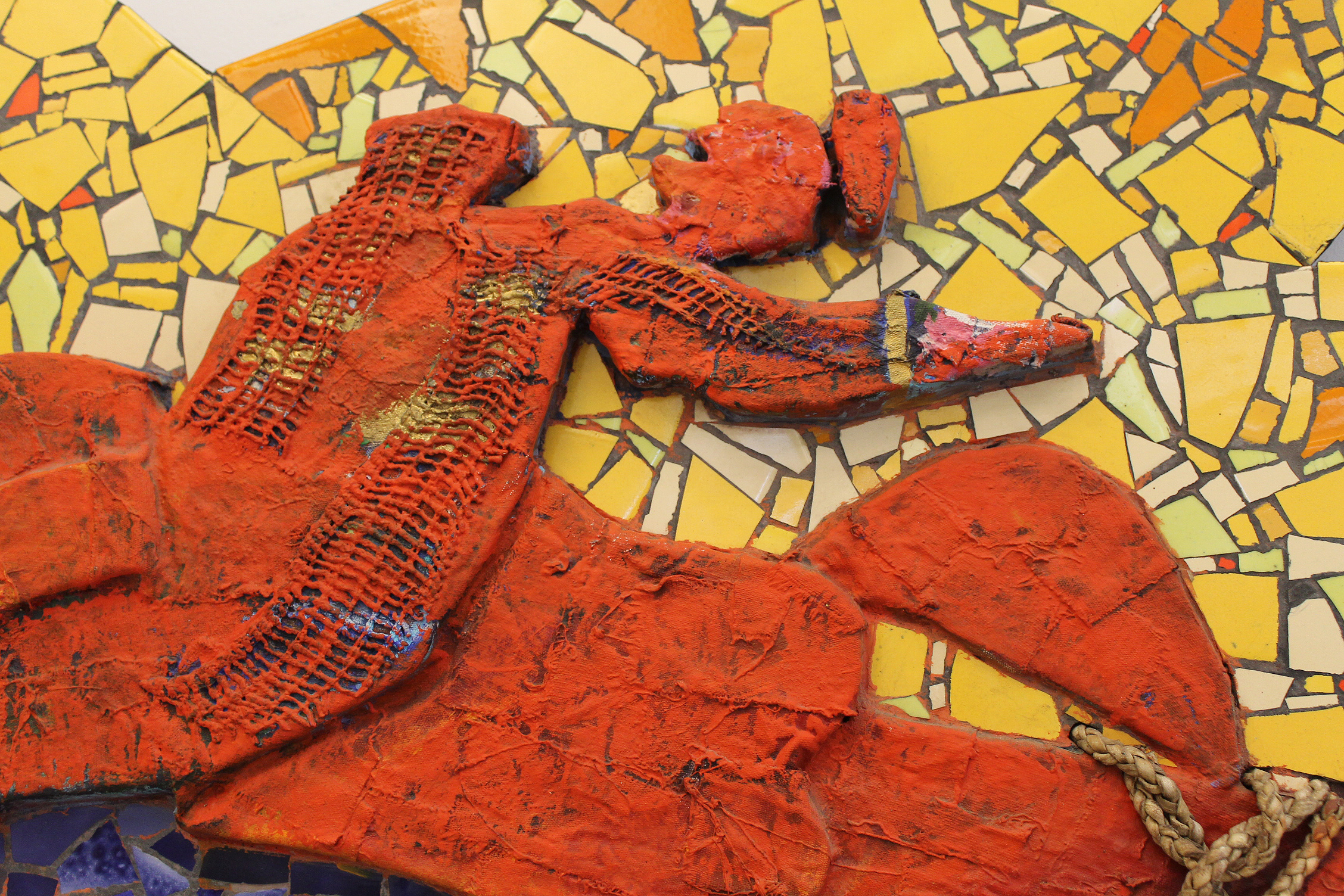La obra está inspirada en el momento en el que al General Paz le bolean el caballo, después de una batalla con Quiroga, y lo toman prisionero durante muchos años, tiempo en el que transcurre una parte importante de la historia argentina entre unitarios y federales. Estos sucesos dieron pie a la realización de esta obra, que por un lado rompe el marco, la obra está inscripta en un cuadrado de 1 metro por 1 metro pero los bordes son irregulares; por otra parte está hecho sobre un fondo de mosaico amarillo y azul, la figura del general Paz y el caballo están hechas en papel mache pintado. Las boleadoras son auténticas, compradas en una casa de regionales. Esta obra es de gran interés personal, es una interesante propuesta plástica y de factura.![]()