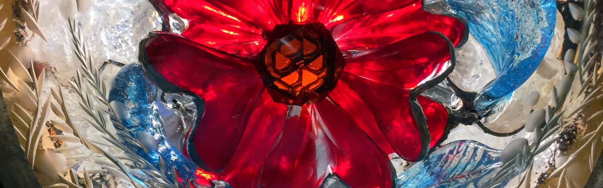 «El tiempo y el círculo como cimiento, vidrios horneados a cientos y a miles de grados. De las calotas que quedan adheridas a las cañas de metal donde nace un vidrio soplado surgen estos rojos y acorazonados pétalos, vítreas hojas y flores se amalgaman. El marco, un viejo reloj de madera vestido con antiguos espejos tallados reflejan que todo reflorece y el círculo continúa.»