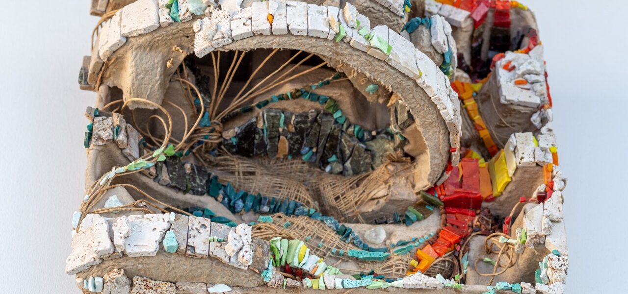 Cartón, piedras, smalti, hilos de papel, arpillera, semillas.