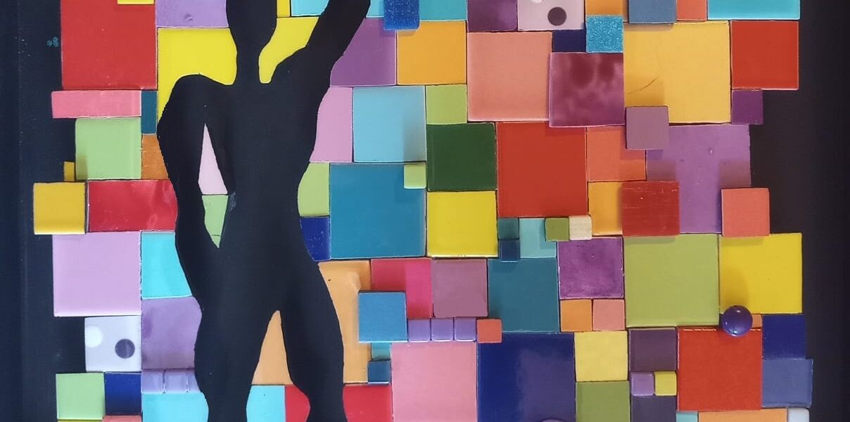 Azulejos esmaltados y teselas vítreas, sobre placa de MDF, en bastidor de MDF pintado con esmalte satinado al agua.