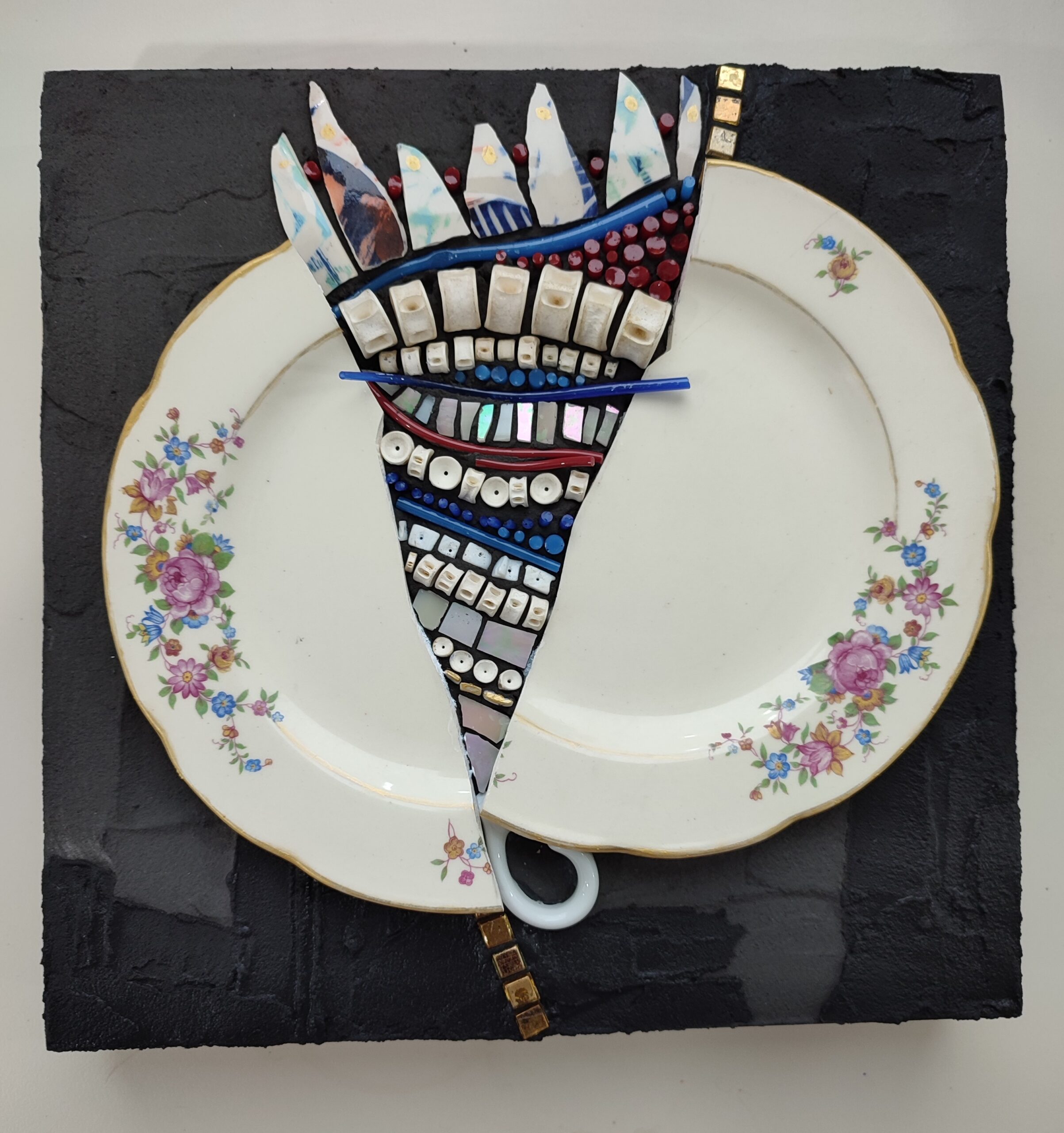 Vajilla antigua de ceramica, hilos de vidrio, cuentas de bijou, teselas de vidrio, resina.