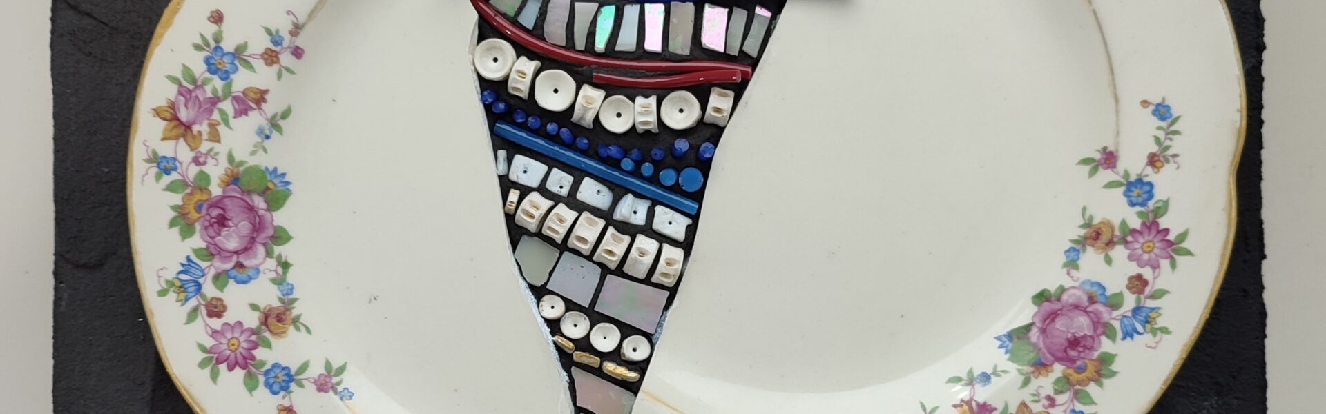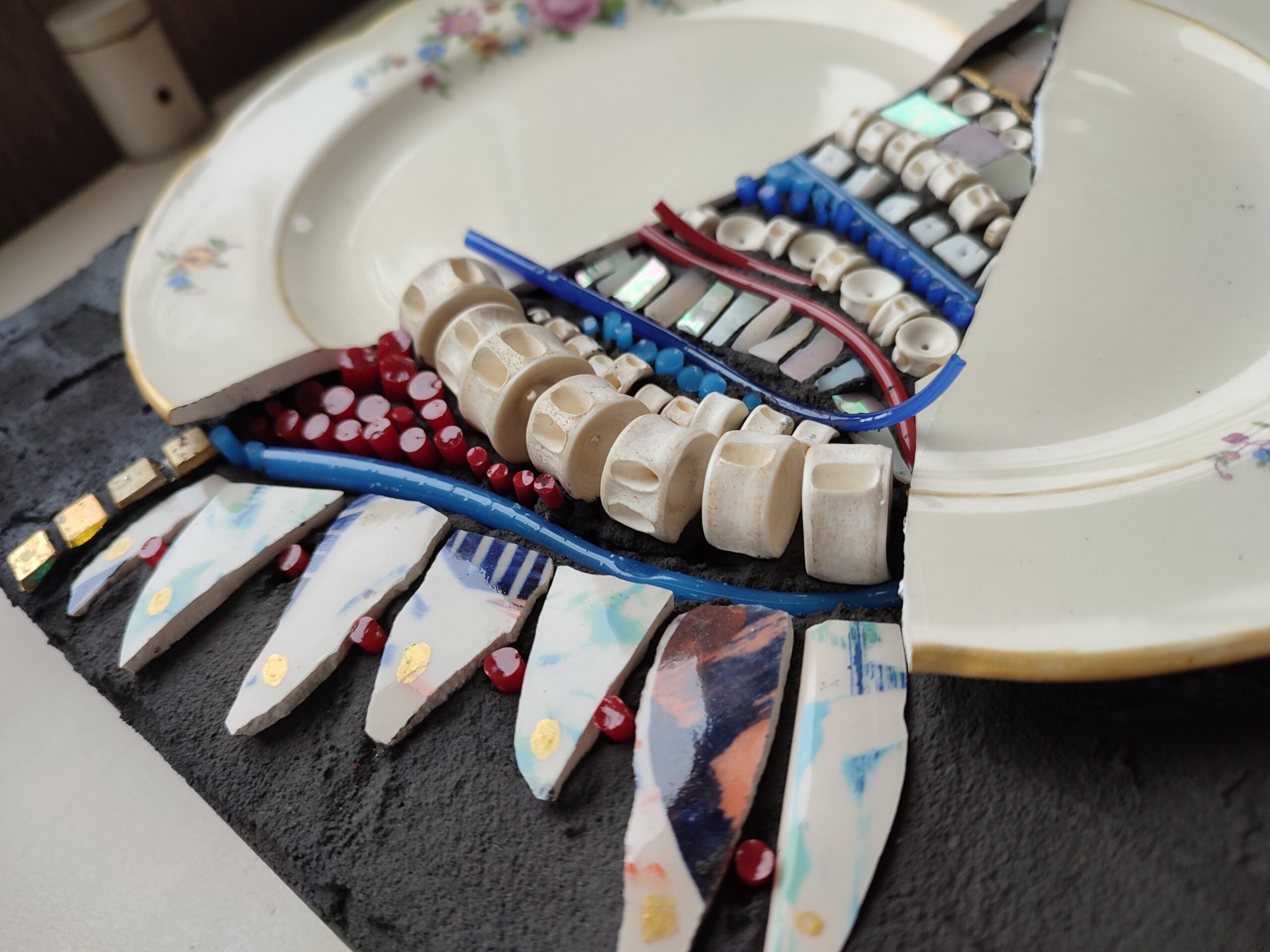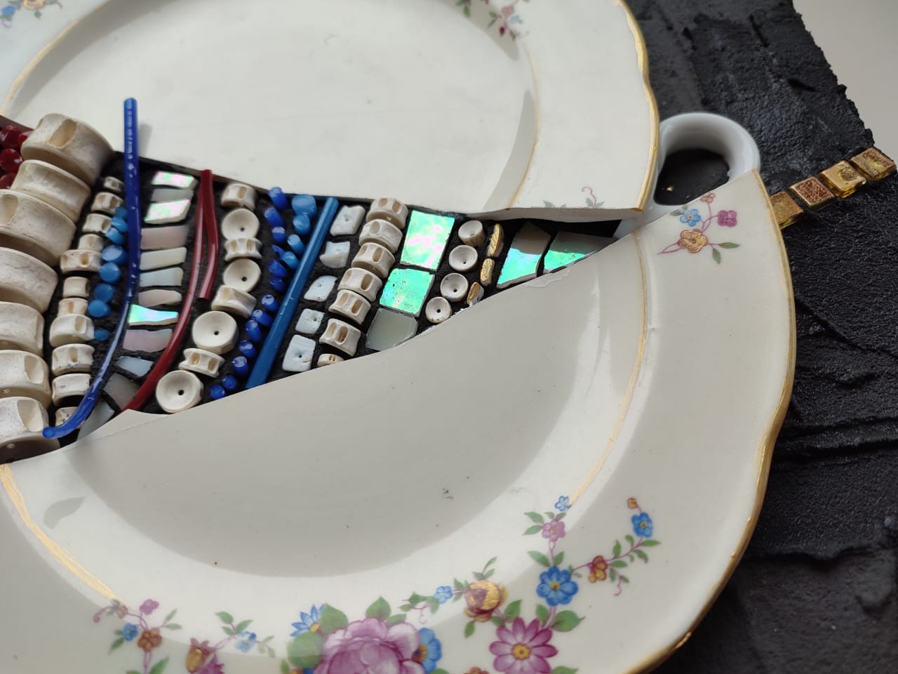 Vajilla antigua de ceramica, hilos de vidrio, cuentas de bijou, teselas de vidrio, resina.