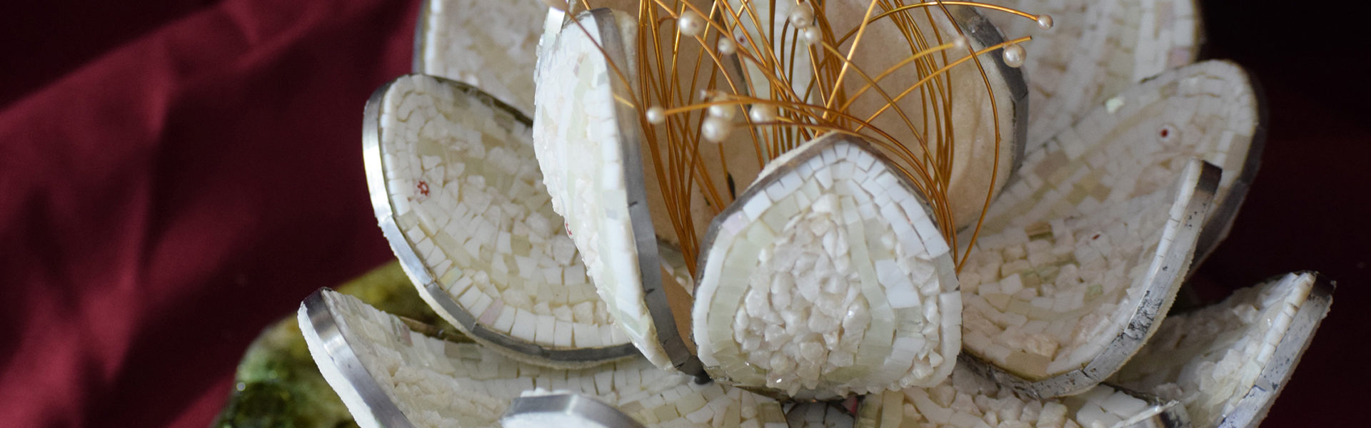 Materiales: La misma está construida con dos tipos distintos de alambre, papel y cola para formar los pétalos de la flor. Los bordes de esto pétalos están recubiertos con una cinta de alpaca. Sobre esto se aplicaron pequeñas piezas de vidrio y mármol cortadas una a una (con distintos tipos de tenazas), gemas y “millefiori”siguiendo un andamento. Los pétalos están montados sobre una estructura de hierro pintado. Las hojas de la flor son piezas realizadas en vitrofusión.