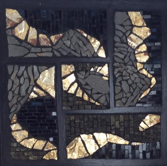 Materiales: azulejos con resinas y láminas doradas, venecitas, lajas laminadas y teselas de piedra.