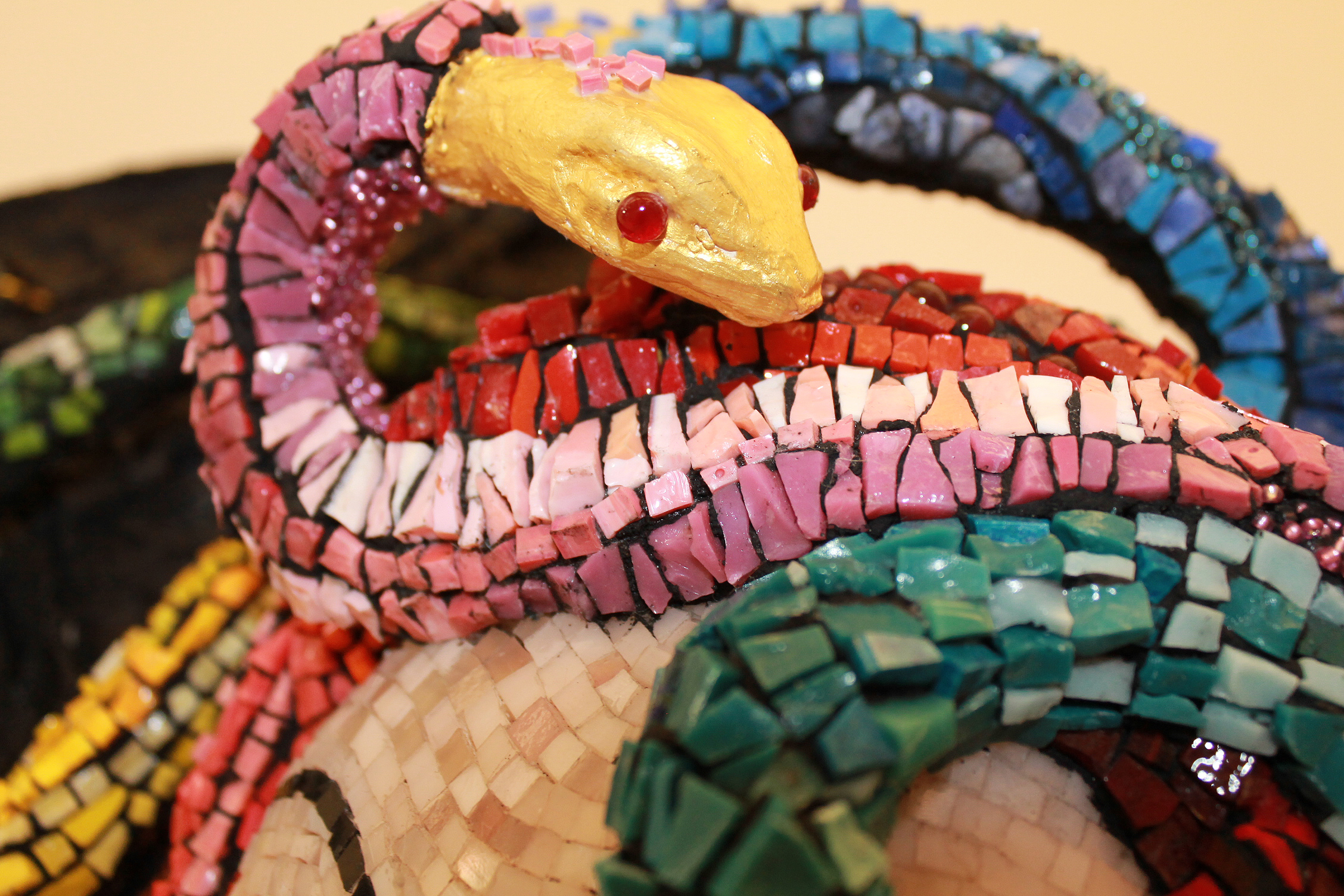 Los mitos nos ponen en presencia de mundos fantásticos, extraordinarios. Mundos cargados de sacralidad donde dioses, semidioses y mortales conviven entre si. Esta obra representa el mito de la Medusa. Sacerdotisa, bella mujer, víctima, villana monstruosa, deidad poderosa… ella es todo eso y mucho más. Su naturaleza mercuriana la convierte en una fuente inagotable de fascinación. En cierto sentido ella es vehículo de nuestras proyecciones colectivas tanto de miedo como de deseo; también es un símbolo de la ira y la sexualidad de la mujer generadas por las mismas fuerzas patriarcales que busca transformar.