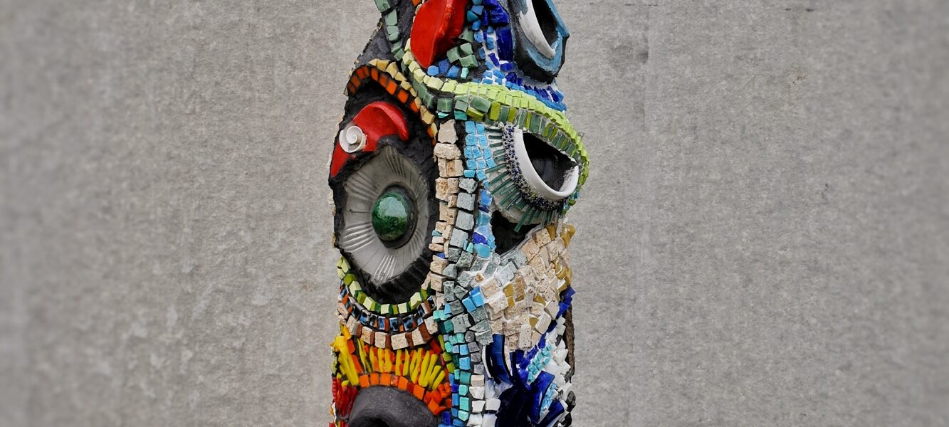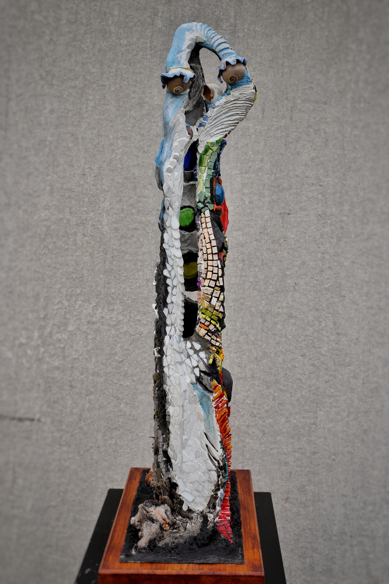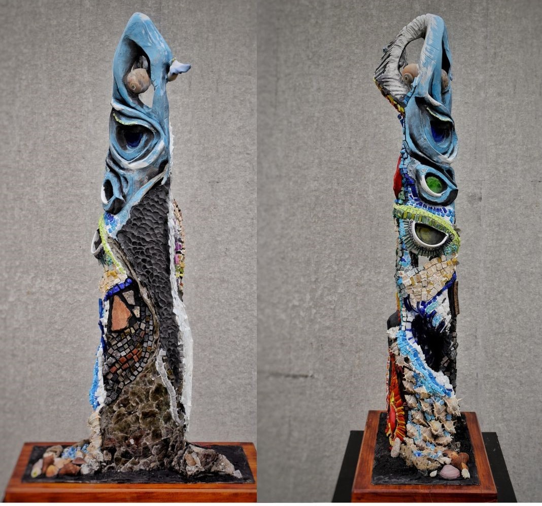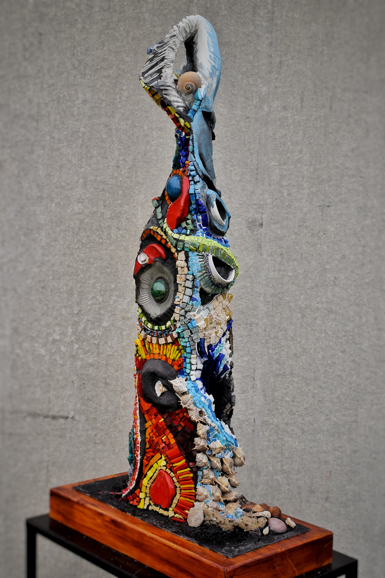 El Oráculo de la Naturaleza» está creado a partir de diferentes materiales para representar al Fuego, Agua, Tierra y Aire, sus diferentes texturas y colores son como la Naturaleza que se intenta comunicar como lo hicieron los Oráculos desde los tiempos remotos. La obra envuelta por los cuatro elementos de la naturaleza con el vigor fálico, lo viril y lo fecundo, el tanos y el eros en constante evolución y punción pueden definir las energías arquetípicas que tienen su efecto en nuestro Ser, nuestra conciencia y forma de entender el mundo. Los cuatro reinos elementales contienen a nuestro Éter (espíritu), que fue involucionando a medida que el humano fue evolucionando, esto está representado en el estrecho hueco interior de la obra, como la continuidad del aire, culminando en los ojos que intentan conectar con el espectador a través de dos caracoles, elementos que durante años las Pitonisas utilizaron para decodificar los mensajes de los dioses. Los ojos pueden ser observados también desde el sector del fuego, porque para que este elemento esté vivo necesita del aire, el color verde, y azul dan cuenta de ello; entremezclandose con los predominantes rojos, anaranjados y amarillos, que rítmicamente acompañan las lenguas de fuego, que muchas veces dejan las huellas negras de las cenizas. En los principios de la creación, el Agua fluyó a través de las piedras generando vida, el oráculo con los caracoles siguió comunicándose y desde el hueco interior del ser, la arena transformada en vidrios azules profundos rigió las mareas y durante años los marineros a través de sus catalejos leyeron las calmas y las tormentas. La Tierra se transforma al igual que sus piedras, opacas y brillantes, y su arcilla en las manos de los humanos con la ayuda de su opuesto, el fuego, han dejado los vestigios de los tiestos alfareros visibilizando la historia originaria. A través de esta obra, su artista intenta que todos los espectadores se conviertan en Pitonisas de sus propias vidas, escuchando los mensajes de los cuatro elementos de la naturaleza, logrando evolucionar su espíritu en armonía con otros seres, generando los Mundos Fantásticos de la especie.![]()