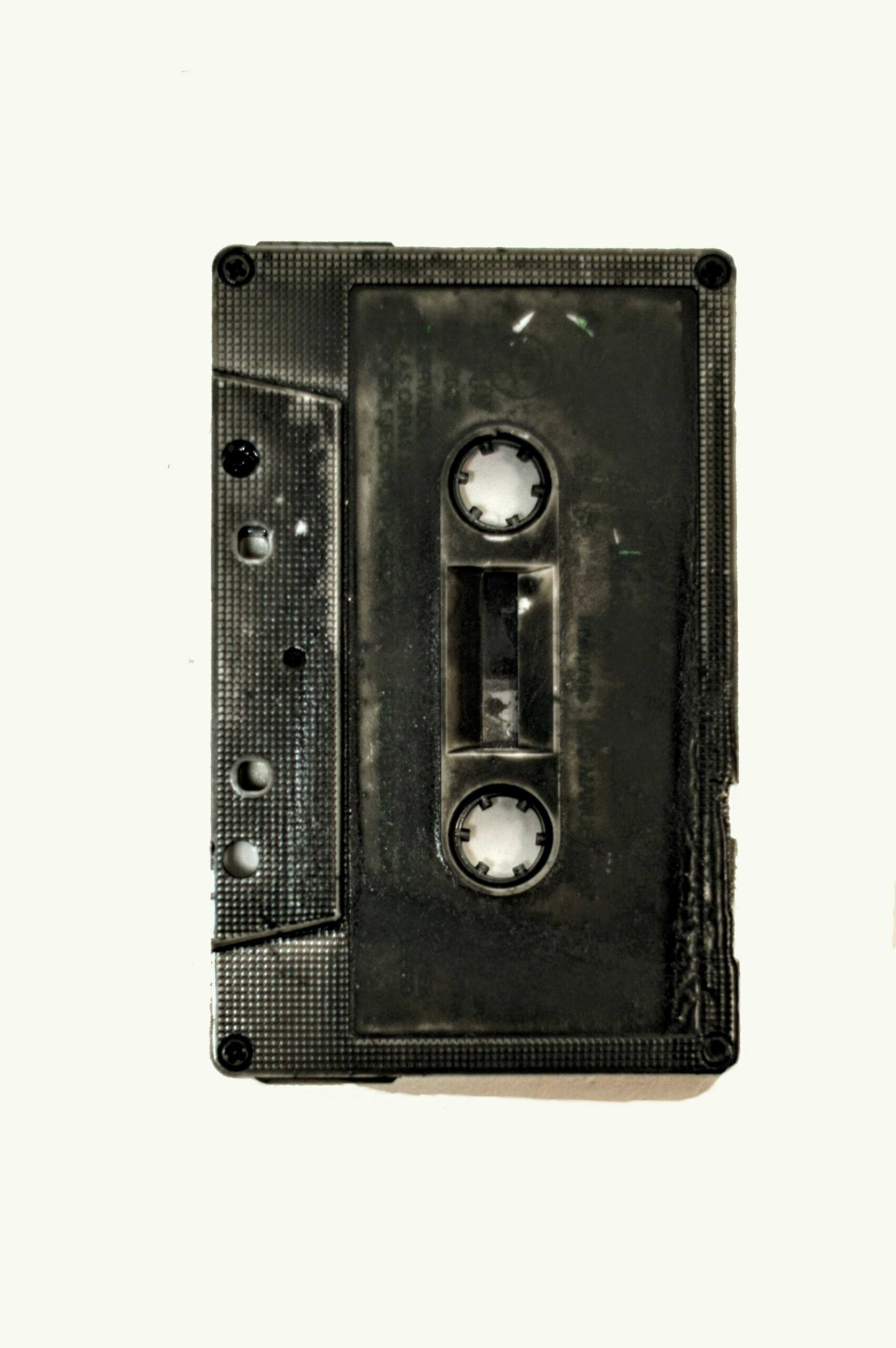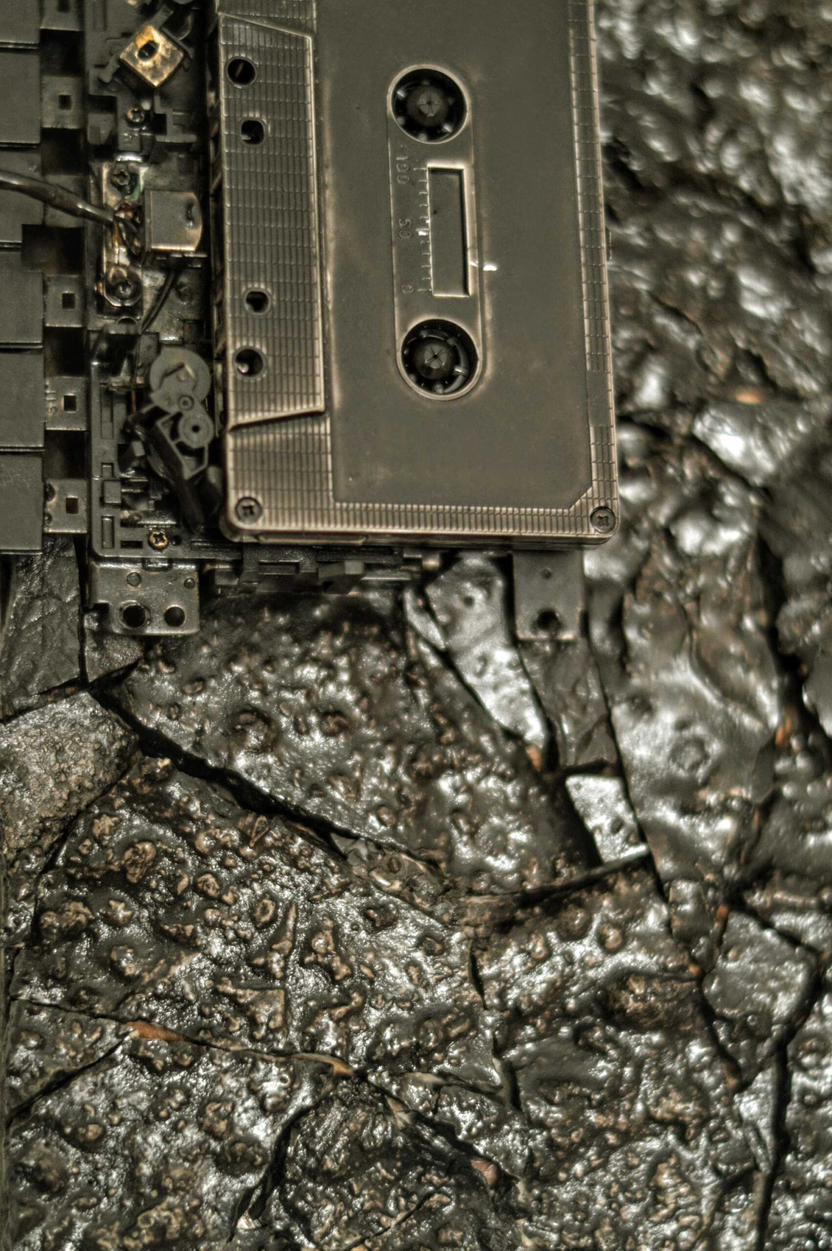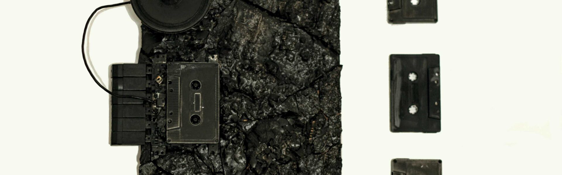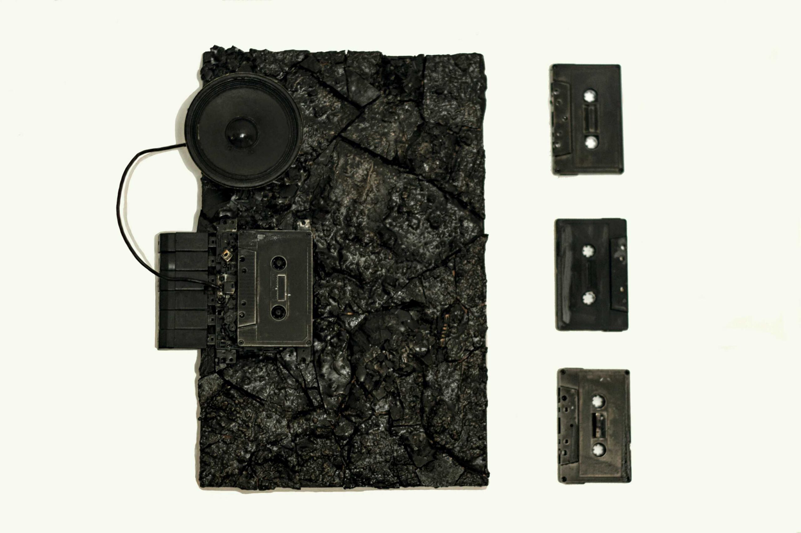 Cassettes de audio, parlante, teselas de cemento, y esmalte sintético.