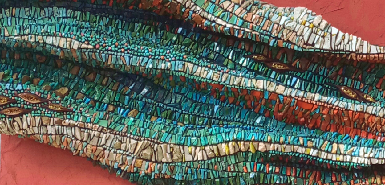 Para mí obra utilicé smalti, azulejo, venecitas, mármol, piedras naturales que llevé del Lago Argentino, cable, y algunos elementos naturales que junté en el lugar. Elegí colores relacionados al río Seyhan, del cual trataba mi obra. Además, aludía a la flor y fruto de la naranja.