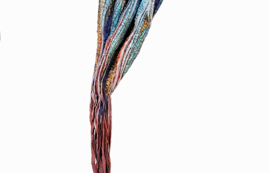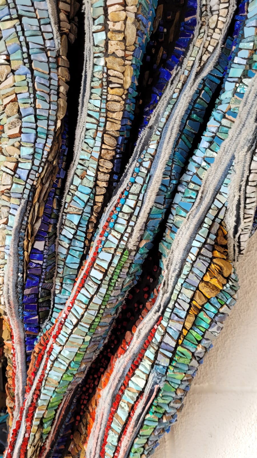 Smalti, venecitas, porcelana, vajilla, cerámicos reutilizados, cable, azulejos, piedras y elementos naturales de la costa del Lago Argentino