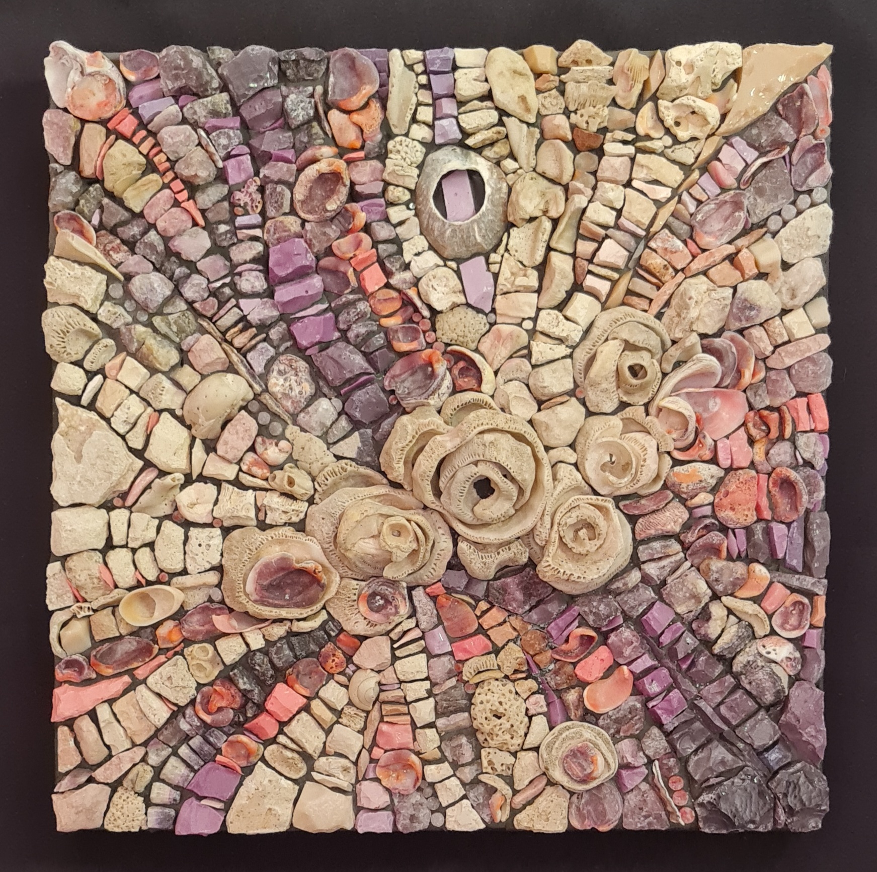 Caracoles, piedras naturales, smalti, resinas, hilos de vidrio y pasta piedra.