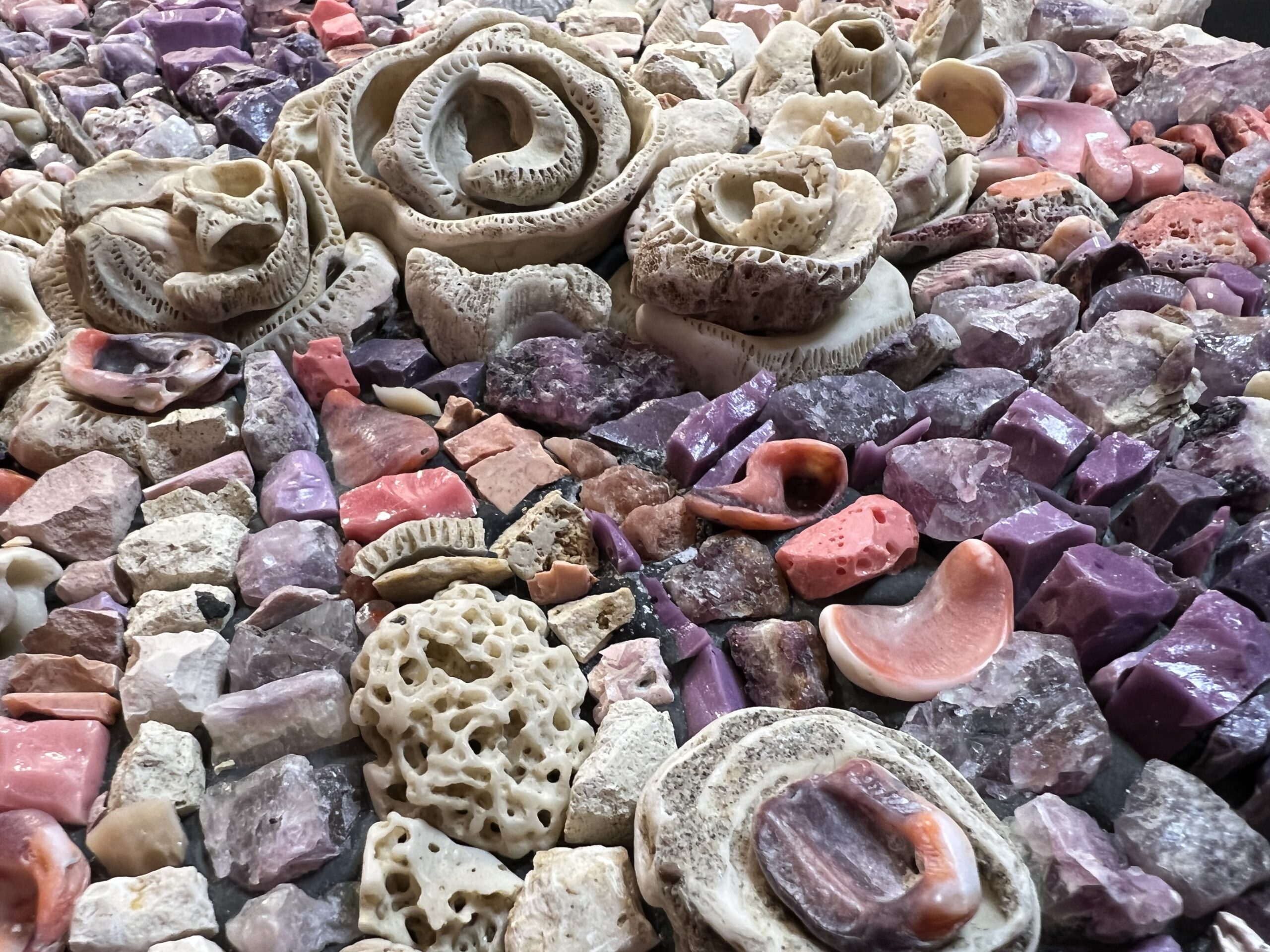 Caracoles, piedras naturales, smalti, resinas, hilos de vidrio y pasta piedra.